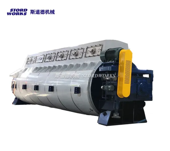 Disc sludge dryer can be heated both by the rotor and the stator, which greatly increases the drying area, improves the thermal efficiency and ensures the material is fully dried. The dryer is composed of a horizontal stator and a rotor. The heating tubes are installed on the rotor and with the paddles on the sides, which' angels can be adjusted. It's for heating the materials when working and also pushing the materials to the discharge end. The steam distribution device can make the steam evenly distributed to each heating tube. The steam flows inside the heating tube, makes the heating tube to keep constant temperature. Then the condensate will be discharged through the special device at the end of the shaft.