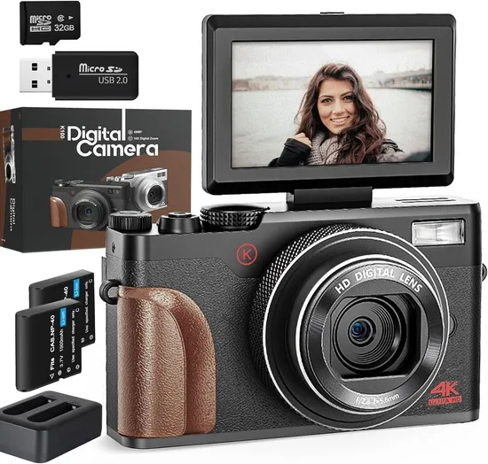 Product Description [4K Digital Camera for Photography]: The 48MP image resolution combined with the 3inch HD IPS screen ensures that your photos and videos are incredibly sharp and vibrant, allowing you to relive every moment with clarity. [Multifunction Video Camera & Anti-Shake]: Capture the Perfect Shot. Use the Dial button at the top of the camera. From auto mode for quick and easy shooting to specialized modes like night scene and portrait, this camera offers a variety of shooting modes to suit any situation. With the high sensitivity mode, even low-light conditions won't stop you from capturing amazing photos. Supports Anti-shake. [Portable for Travel & Long Battery Life]: The digital camera is only 280g (9.8 ounces), very lightweight, and comes with a shoulder strap that can be hung around the neck or carried on the back, making it very portable. It is a great travel camera, and the entire digital camera set comes with two batteries, providing a very long standby time. [Travel & Portable Design]: Your Perfect Travel Companion With its portable design and compact size, this camera is the ideal travel companion. It also doubles as a webcam, allowing you to connect with your loved ones, vlog, or attend video conferences with ease. [16X digital zoom & Bonus 32G SD Card]: With the 16x digital zoom, you can get up close to your subjects or capture stunning wide-angle shots of breathtaking landscapes. It's like having a professional lens in your pocket.Start capturing memories right away with the included 32G SD card. You'll have plenty of storage space for all your photos and videos, allowing you to focus on what matters most - capturing precious moments