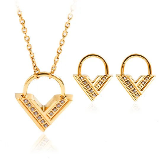 | Name | Stainless steel V letter set Necklace Earrings Jewelry plated 18K gold diamond letter necklace |