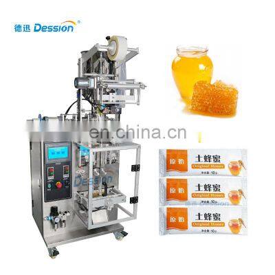 Automatic Vertical 5g 10g Packaging System Food Honey Sachet Packing MachineProduct DescriptionDession liquid packing machine is suitable for the packaging of various liquid and sauces, such as soup,edible oil,liquid medicine,cream,seasoning sauce,honey,shampoo and shower gel etc.According to customer needs,the bag types can be changed:back seal, three sides seal, four side seal.1. The section where the material contact is stainless steel as the body of machine is optional for complete or partial stainless steel and all out equipments have passed the CE Standard.2. Optional English or other languages screen display, easy and simple operation. 3. High-sensitivity photoelectric color tracing and digital input of cutting position get more accuracy.4. Packaging speed and length of bags can be set to some extent without further adjustment and parts changing packaging speed and length of bags can be set to some extent without further adjustment and parts changing. 5. Bag-making, filling, sealing, cutting, counting can be achieved automatically and straightly. 6. Bag-making equipment can be changed according to specific requirement of customers and products.Model NO.DS-200YMeasuringLiquid Filling PumpBag ShapeBack Sealing / 3 Sides Sealing / 4 Sides SealingPacking Speed30~80 bags/minRoll WidthMax.200mmBag Length30~180 mmBag Width15~100 mmMachine SizeL)640*W)700*H)1580mmMachine Weight300kgPower220V,50HZ,1.2KVAEasy Control Touch ScreenLanguage: Standard English and Chinese. Any language can be customized.PLC: Imported PLC microcomputer with interface and frequency control enables bag parameter setting more convenient and easier. Film RollerThe film can be replaced easily on the film roller.Various films adaptable: OPP/CPP,OPP/CE,MST/PE/PET/PE.Pneumatic liquid pumpthe filling weight is adjusted,the texture of the machine is #304 stainless steel for the material contact parts.It is safe andmeets with the GMP standard.According to the viscosity of the filled liquid, you can choose to replace the mechanical pump.Bag Former#304 stainless steel bag former is for shaping the film into a bag.Different bag width needs different bag former.Durable Sealing Cutting BladesHigh speed of fine and clean cutting and sealing bags.Positioned stop function avoides sticking blades and wasting materials.According to customer needs,the bag types can be changed:back seal, three sides seal, four side seal.According to your needs, you can choose to replace or add the following configuration. For example, 3 sides sealing device, 4 sides sealing device, linking bag device, gas-filled device, easy tearing device.According to the consistency of the filling material, add a heating and stirring device or use the mechanical pump.If you want to know more about the machine, please contact me!!!SALES : JimmyMobile:+86 18128744708Whatsapp / Wechat: +86 18128744708Related ProductsOur CompanyCertificationsPacking & DeliveryPayment1.T/T and Western Union are accepted2.30% deposit before production and 70% balance before shipment3.All banking charges outside China are on buyersShipping1.Upon receipt of payment , delivery date will be in 15-30 working days,2.By Air, by Sea or by Express (DHL etc)3.Shipment cost will depend on the destination, shipment way and the weight of the goodsFAQQ1:Do you have manual or operation video for us to know more about the machine? Yes, not only manual or operation video, 3D drawing also available to make as per your design,also the video we can make of testing the material from our packaging machine if your packing goods easier for us to find from our local market. Q2:How can I trust you for the first time business ?Please note our above business license and certificate. And if you don't trust us, then we can use Alibaba trade assurance service, guarantee your money, and guarantee your machine's on-time delivery and machine quality.Q3:Is engineer available to serve oversea?Yes, but the travel fee is paid by you. So actually to save your cost, we will send you a video of full details machine installation and assist you till the end.Q4:How can we make sure about the machine quality after we put the order?Before delivery, we will send you the pictures and videos for you to check the quality, and also you can arrange for quality checking by yourself or by your contacts in China.Q5:Will you provides the door to door service?Yes. Please offer us your final destination, we will check with our agent to see if it available, and most of the area is ok for us to clearing and sending in your countries.Our Service