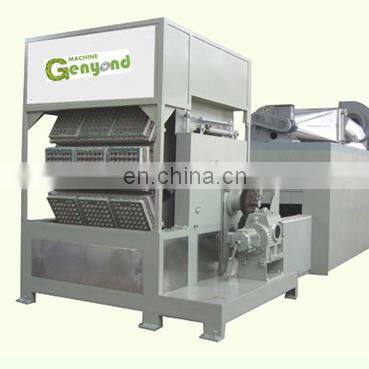 Product Description Fully Automatic Pulped Paper Egg Tray Making Machine Machine for make paper egg tray,egg tray making machine,egg tray machine,paper tray machine.pulp moulding machine The quality of our egg tray making machines is superior to that of other suppliers,and our prices are lower than theirs. Egg tray forming machine is a kind of machine which absorbs paper pulp-the raw material, on the surface of mould by vacuum to get various shape and ratio of wet and dry by regulating time. After such working procedure as transferring moulds, releasing moulds to complete paper tray production. Our forming machines adopt advanced PLC programmable controller; selecting of high quality electronic devices and pneumatic components; using stainless steel pulp barrels with high performance and long service life. various types and output of egg tray making machines can be supplied by our company ,such as 800-1000pcs per hour ,2000pcs per hour,3000pcs per hour ,4000pcs per hour ,and so on . The quality of our egg tray making machines is superior to that of other suppliers,and our prices are lower than theirs. if you are interested in our machines,pls contact me ,i will send the details of machine to you Reciprocating type egg tray machine reference picture as the following: 1. Pulping system Pulper, 1.0M3,15kw; vibration screen, 0.9M2,3kw; mixer; pulp pump;water pump,control cabinet for pulping system,etc 2. Forming system Consist of 1pc of forming platen and 1 pc of transfering platen. Platen size:1100x470mm,4sets of 30-cell egg tray molds can be mounted on forming platen. Forming efficiency:5-6cycles/min; Equiped with vacuum auto draining system;auto cleaning system for the forming mold and auto control cabinet. 3. Drying system Outline dimension:20080x2650x3600mm; Single layer conveying chain;heated by section;multi burners; Six layers drying line, energy saving and saving place The temperature of each section can be adjusted independently;burners with French or Italian brand; The energy for option: LPG,GAS,diesel oil,Equiped with auto control cabinet. 5. More pictures Our Services Jessica Chen Tel : +86 21 34796126Mob & Whatsapp & Wechat: +86 18217773391Skype:genyondmachine5Add : No. 1328, Hengnan Road, Pujiang Town, Minhang District,ShanghaiWeb: : http://genyond.en.china.cn