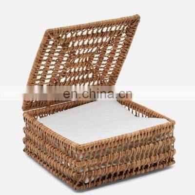 Product DescriptionHot Sale Natural Rattan Luncheon Napkin Holder Cheap Wholesale Tableware wicker napkin basket wovenmade in VietnamThis napkin basket is made from brown rattan and brings a gorgeous natural feel to your table. Designed to fit standard paper napkins, it's perfect for providing napkins as a party, outdoor meal or buffet.Our rattan napkin holder is definitely going beyond your expectation because it comes from clean natural material, protect the environment and your family's health. No napkin holder is entirely identical because of handmade craft and natural material.The product is carefully handled in each step so it does not smell, is very smooth and does not cause scratches. The square rattan napkin holder with open design so it is easy to access napkins, can be simply cleaned with damp soft cloth, keep in a cool and dry place.MaterialRattanUsageDecorativeShapeSquareCommercial BuyerRestaurants, Food & Beverage Stores, Hotels, Gifts StoresSeasonEverydayDesign StyleRusticRelated ProductRecommended By SellerMain MaterialMain MarketsPackaging & DeliveryOur Selling PointsCompany Profile