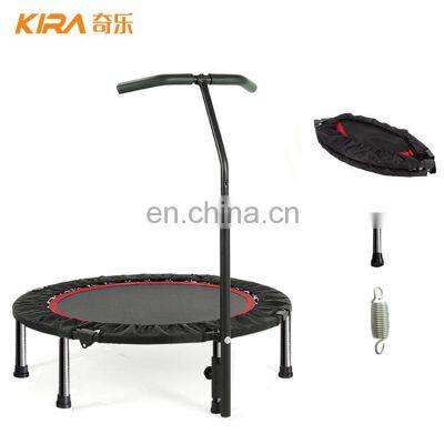 Product DescriptionProduct Name: 40inch indoor mini fitness trampoline with handleKeywords:mini trampoline, fitness trampoline, trampoline with handleUsage:Kids and AdultsSize:40 inchGross weight:13KGDistance from floor:22cmHeight:87-110cmNumber of legs:6 piecesDiameter of spring material3.2mmPacking size:80x40x14cmTube thickness:1.2mmBearing weight:200KGJumping mat:PP mat Covering pad:PVC+PEDetailed ImagesThe handle with soft tubeHigh strength springsHigh quality legs Installation InstructionsRelated ProductsCompany Introduction