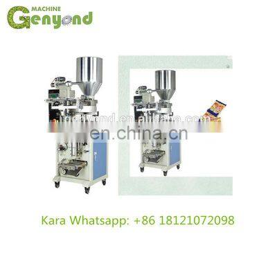 Vertical Bag Packing Machine/Grain Vertical Small Packing Machine Introduction and characteristics:1. The machine is featured with compact structure, durable, logical design and Precise.2. It adopts light sensor control system, and is featured with reliable, stable performance.3. Using VVVF, operation much more stable, low noise, with low malfunction.4. It can finish automatically all processes, such as measuring, filling and bag marking.5. With spring pressure knife principle, pneumatic cutting, 5 linking bags more stable Application:Suitable for packing puffed food, shrimp strip, peanut, cooked seeds, rice, seed, monosodium glutamate, popcorn and other grain, strip and flake shaped solid material. Technique specification: Machine modelGY-160Max. width of coiled film320mmBag length30-200mmBag width50-150mmMeasuring range50-500mlPackaging speed30-80bags/minExternal diameter of coiled materialMax.300mmPacking film thickness0.04-0.08mmPower supply specification220B50Hz.2kwMachine weight350kgPacking MaterialOPP/CPP.OPP/CE.MST/PE/PET/PEOther Details: 1.Package: wooden cases for sea transportation2.Delivery time: 30 working days after receiving the deposit3.Installation : engineers available for installation and training overseas4.Guarantee : 12 months after it is sent out Plz feel free to contact me for any further information.Contact:Kara GENYOND MACHINERY INDUSTRIAL GROUP LIMITEDNO.1328 Hengnan Road Minhang District 200000 ShanghaiMob/ WhatsApp: +86 18121072098Skype /Wechat: 18121072098
