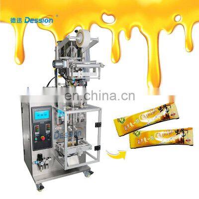 Automatic Dession DS-200Y Liquid Honey Packing Machine With Heating and Stirring DeviceProduct DescriptionDession liquid packing machine is suitable for the packaging of various liquid and sauces, such as soup,edible oil,liquid medicine,cream,seasoning sauce,honey,shampoo and shower gel etc.According to customer needs,the bag types can be changed:back seal, three sides seal, four side seal.1. The section where the material contact is stainless steel as the body of machine is optional for complete or partial stainless steel and all out equipments have passed the CE Standard.2. Optional English or other languages screen display, easy and simple operation. 3. High-sensitivity photoelectric color tracing and digital input of cutting position get more accuracy.4. Packaging speed and length of bags can be set to some extent without further adjustment and parts changing packaging speed and length of bags can be set to some extent without further adjustment and parts changing. 5. Bag-making, filling, sealing, cutting, counting can be achieved automatically and straightly. 6. Bag-making equipment can be changed according to specific requirement of customers and products.Model NO.DS-200YMeasuringLiquid Filling PumpBag ShapeBack Sealing / 3 Sides Sealing / 4 Sides SealingPacking Speed30~80 bags/minRoll WidthMax.200mmBag Length30~180 mmBag Width15~100 mmMachine SizeL)640*W)700*H)1580mmMachine Weight300kgPower220V,50HZ,1.2KVAEasy Control Touch ScreenLanguage: Standard English and Chinese. Any language can be customized.PLC: Imported PLC microcomputer with interface and frequency control enables bag parameter setting more convenient and easier. Film RollerThe film can be replaced easily on the film roller.Various films adaptable: OPP/CPP,OPP/CE,MST/PE/PET/PE.Pneumatic liquid pumpthe filling weight is adjusted,the texture of the machine is #304 stainless steel for the material contact parts.It is safe andmeets with the GMP standard.According to the viscosity of the filled liquid, you can choose to replace the mechanical pump.Bag Former#304 stainless steel bag former is for shaping the film into a bag.Different bag width needs different bag former.Durable Sealing Cutting BladesHigh speed of fine and clean cutting and sealing bags.Positioned stop function avoides sticking blades and wasting materials.According to customer needs,the bag types can be changed:back seal, three sides seal, four side seal.According to your needs, you can choose to replace or add the following configuration. For example, 3 sides sealing device, 4 sides sealing device, linking bag device, gas-filled device, easy tearing device.According to the consistency of the filling material, add a heating and stirring device or use the mechanical pump.Related ProductsOur CompanyCertificationsPacking & DeliveryPayment1.T/T and Western Union are accepted2.30% deposit before production and 70% balance before shipment3.All banking charges outside China are on buyersShipping1.Upon receipt of payment , delivery date will be in 15-30 working days,2.By Air, by Sea or by Express (DHL etc)3.Shipment cost will depend on the destination, shipment way and the weight of the goodsFAQQ1:Do you have manual or operation video for us to know more about the machine? Yes, not only manual or operation video, 3D drawing also available to make as per your design,also the video we can make of testing the material from our packaging machine if your packing goods easier for us to find from our local market. Q2:How can I trust you for the first time business ?Please note our above business license and certificate. And if you don't trust us, then we can use Alibaba trade assurance service, guarantee your money, and guarantee your machine's on-time delivery and machine quality.Q3:Is engineer available to serve oversea?Yes, but the travel fee is paid by you. So actually to save your cost, we will send you a video of full details machine installation and assist you till the end.Q4:How can we make sure about the machine quality after we put the order?Before delivery, we will send you the pictures and videos for you to check the quality, and also you can arrange for quality checking by yourself or by your contacts in China.Q5:Will you provides the door to door service?Yes. Please offer us your final destination, we will check with our agent to see if it available, and most of the area is ok for us to clearing and sending in your countries.Our Service