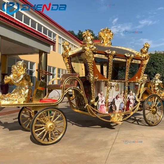 Horse Carriage Carts Royal Electric Vehicle Details Surface treatment: epoxy zinc-rich primer, 2k car paint. Structure: streamlined body, front small wheels, rear big wheels. Body: It is made of cold-rolled sheet, thick galvanized pipe and all metal welded, strong and beautiful. Seating; 1-2 people for groom seats, 4-6 people for guest seats. Car seat; high-precision sponge, special soft leather for outdoor use, classic buckle design, human backrest, high elasticity and pressure resistance, durability, beautiful appearance, and comfortable ride. Wheels: front wheel 75cm, rear wheel 100cm: thick galvanized spokes, natural solid rubber tires, good elasticity, lifelong maintenance-free, durable. Steering: Using flat bearings with a diameter of 450mm, with large contact surface and stable body. Shock absorption: The front wheel is a three-point bridge type shock absorption, which is stable, and the rear wheel is a bow-shaped leaf spring with a strong bearing capacity. Brake system: adopts automobile standard hydraulic disc brake. Dimensions: 4.20 meters long, 1.6 meters wide and 2.3 meters high. Purpose; wedding car, wedding photography, event car, tourist car, etc. Historical royal horse carriage for sightseeing/special transportation/Cinderella horse carriage for sale
