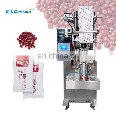 automatic beans packing machine accuracy weighting pouch grain packaging machineryProduct DescriptionDession granule packing machine is suitable for loose rounded granules in the food, chemical and other industrial. Such as: puffed granules, peanuts, popcorn,melon seeds, rice, pepper, sugar,salt, biscuits etc.According to customer needs,the bag types can be changed:back seal, three sides seal, four side seal.1. The section where the material contact is stainless steel as the body of machine is optional for complete or partial stainless steel and all out equipments have passed the CE Standard.2. Optional English or other languages screen display, easy and simple operation. 3. High-sensitivity photoelectric color tracing and digital input of cutting position get more accuracy.4. Packaging speed and length of bags can be set to some extent without further adjustment and parts changing packaging speed and length of bags can be set to some extent without further adjustment and parts changing. 5. Bag-making, filling, sealing, cutting, counting can be achieved automatically and straightly. 6. Bag-making equipment can be changed according to specific requirement of customers and products.Model NO.DS-320AMeasuringMeasuring cupBag ShapeBack Sealing / 3 Sides Sealing / 4 Sides SealingPacking Speed30-80 bags/minRoll WidthMax.320mmBag Length30~180 mmBag Width15~100 mmMachine SizeL)1100*W)755*H)1540mmMachine Weight300kgPower220V,50/60HZ,1.2KVAEasy Control Touch ScreenLanguage: Standard English and Chinese. Any language can be customized.PLC: Imported PLC microcomputer with interface and frequency control enables bag parameter setting more convenient and easier. Film RollerThe film can be replaced easily on the film roller.Various films adaptable: OPP/CPP,OPP/CE,MST/PE/PET/PE.Measuring cup#304 stainless steel measurement parts will measure the weight of each bag automatically.Bag Former#304 stainless steel bag former is for shaping the film into a bag.Different bag width needs different bag former.Bag Cutting DeviceHigh speed of fine and clean cutting and sealing bags.Positioned stop function avoides sticking blades and wasting materials.According to customer needs,the bag types can be changed:back seal, three sides seal, four side seal.Depending on your needs, you can choose to replace or add the following configuration. For example, 3 sides sealing device, 4 sides sealing device, linking bag device, gas-filled device, easy tearing device and hole device.If you want to get best price,please contact me!!SALES MANAGER: Kenny LeeMobile/Whatsapp/Wechat: +86 13380522184Related ProductsOur CompanyCertificationsPacking & DeliveryPayment1.T/T and Western Union are accepted2.30% deposit before production and 70% balance before shipment3.All banking charges outside China are on buyersShipping1.Upon receipt of payment , delivery date will be in 15-30 working days,2.By Air, by Sea or by Express (DHL etc)3.Shipment cost will depend on the destination, shipment way and the weight of the goodsFAQQ1:Do you have manual or operation video for us to know more about the machine? Yes, not only manual or operation video, 3D drawing also available to make as per your design,also the video we can make of testing the material from our packaging machine if your packing goods easier for us to find from our local market. Q2:How can I trust you for the first time business ?Please note our above business license and certificate. And if you don't trust us, then we can use Alibaba trade assuranceservice, guarantee your money, and guarantee your machine's on-time delivery and machine quality.Q3:Is engineer available to serve oversea?Yes, but the travel fee is paid by you. So actually to save your cost, we will send you a video of full details machine installation and assist you till the end.Q4:How can we make sure about the machine quality after we put the order?Before delivery, we will send you the pictures and videos for you to check the quality, and also you can arrange for quality checking by yourself or by your contacts in China.Q5:Will you provides the door to door service?Yes. Please offer us your final destination, we will check with our agent to see if it available, and most of the area is ok for us to clearing and sending in your countries.Our Service