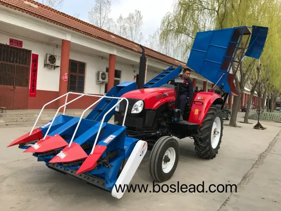 Boslead Corn Harvester is to be operated when being hung clenching the front bracing of a four-wheel tractor and driven by rear power take-off (PTO). It is applicable to ear plucking and straw chopping in corn fields when the ears of corns are ripe. This machine is small in size, high in efficiency, light in weight, easy to operate and can lead to less loss of ears.