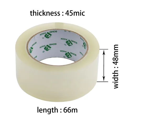 48mm wide and 66m long, with a single layer thickness of tape is 40mic .Packing tape uses environmental protection material, without peculiar smell, can be used at ease. Matching tape dispenser :48mm that is suitable for tape width.It has a sharp serrated cut and can easily cut off the transparent glue anywhere and anytime Good toughness: not easily break,Strong sticky tapes can save you a lot of time in packaging, shipping, and moving. Transparent: difficult to spot when sealing the carton, and ensures the integrity of the gift bag or packing case. Eco-Packaging :Environmental protection packing box, do not take a place, can be stored for a good tape and tapping. STANDARD SIZE FITS ALL: Confused about all the measurements? The dimension of this tape. measures at 48mm Width x 66m Length The diameter inside the core is 3". Our packing tape is perfect of everyday use with a tape dispenser or cut with scissors.