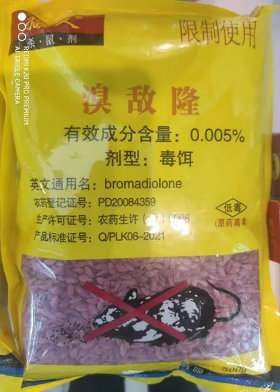 General Information: It belongs to the second-generation anticoagulant which has a good palatability and is popular with all over the world. Usually, it will be safe for the human and non-target animals. Besides, it can be applied to dwelling houses, hotels, restaurants, warehouses, farmland and so on. Technical Data: Common Name: Brodifacoum Active Ingredient: 0.005% Brodifacoum CAS No.: 56073-10-0 Molecular Formula: C31H23BrO3 EC No.: 259-980-5 Individual Packing: 100g/sachet, 500g/bag, 1kg/bag, 1kg/pail, 5kgs/pail, 6.5kgs/pail, 10kgs/pail & 25kgs/drum; Outer Packing: Corrugated Carton or Pallet How To Use: For more safe, putting the Rodenticide Bait inside the bait station then locked, to avoid touching with Children or pets. In the places where mice often appear, put it along the foot of a wall or shadows. Outside, put it nearby mouseholes or mousepassages. 10 to 20g per m2, the stack distance is 5m. The more the quantity of mice is, the more the quantity of stack is. The death time is 2 to 11 days. If has water in circumstances, it will improve the effect of deratization. Cautions: During production or use, should wear respirators, protective gloves and clothing. After putting rodenticides, flush with plenty of water and soap immediately. Be ware of eating by mistake. If do and poisoning, should be sent to the hospital. Package: