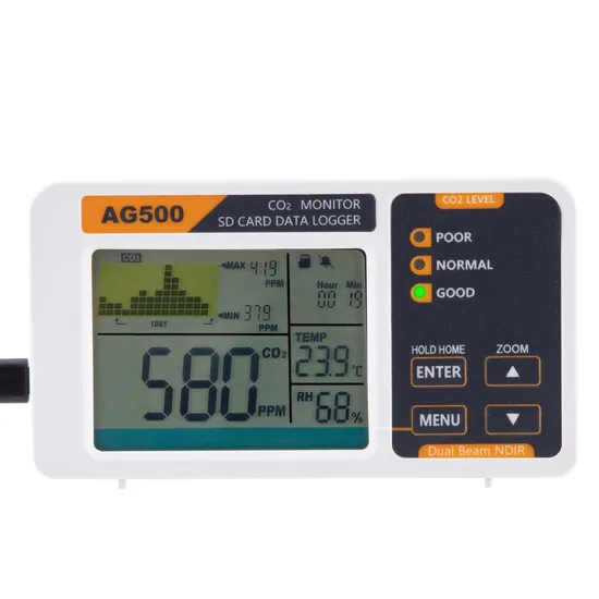 AK 500 is a 4 in 1 CO2 monitor for CO2 level, ambient TEMP, RH and real time clock with data logger and memory SD card.