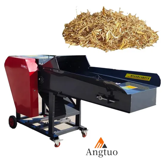 The machine cuts hay, grass, and crop residues like straw or corn stalks into small, uniform pieces suitable for animal consumption.