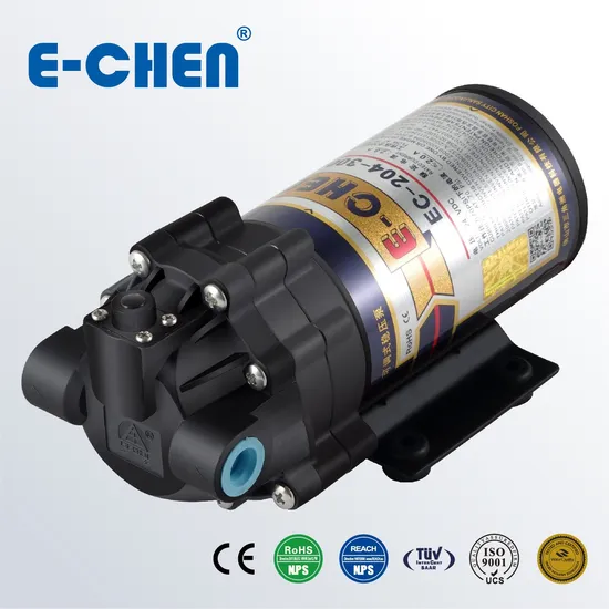 E-CHEN RO Booster Pump 204 Series The 204 series is designed for household RO system for unstable water pressure. The advanced pump head technology stabilizes outlet pressure at 70psi - 80psi while inlet pressure is between 10 - 40 psi. Available at 50, 75, 100, 150, 200, 300, 400, 500 and 600 GPD. Features Constant pressure invetion design on tunnel-type outside circulation to extend the life of RO membrane Solution for water pressure flucctuation problem, suitable pipe pressure: 10-40 psi No influence by climate and temperature No decompression No water leakage problem Constant pressure technology to ensure stable pressure work on RO membrane Materials of Construction Nylon Housing EPDM Valves Santoprene Diaphragm Stainless Steel Fasteners Applications Pre-Filter Water Treatment RO Boost Carbonation Systems Misting Systems Medical Labwater Fuel Cells Reverse Osmosis Water Purification System Packing Net Weight: 2.15Kg/ea Growth Weight: 27.5kg, 12pcs/crt Carton Size: 50 x 26.5 x 35.5 cm EC-204-75A