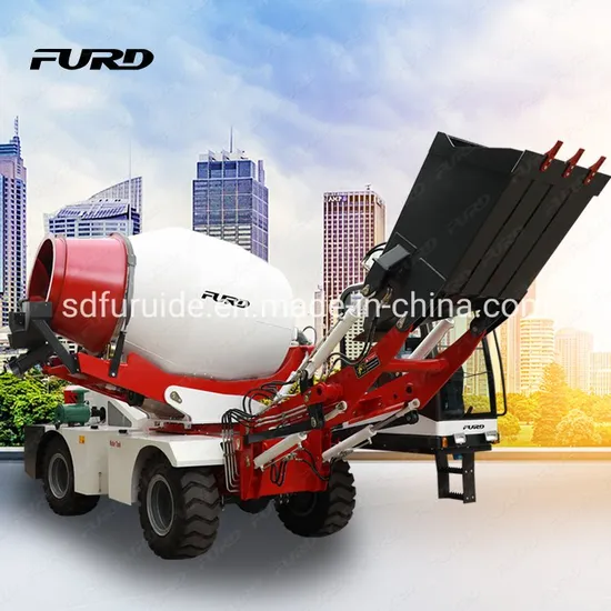 self loading mini concrete mixer with concrete pump mobile trailer FMT-35 FURD Self Loading Concrete Mixer is a kind of multifunctional machinery which combines the transit mixer, concrete mixer and wheel loader together. It can automatically load, measure, mix and discharge concrete mixture. Equipped with powerful diesel engine and 4 wheel drive , the self loading concrete mixer is just like a truck and the operator can drive it to where it needs to go. It is very convenient for loading material, such as cement, aggregate, stone. The mixing drum and cabin could slew together through 270° for high discharge over 2 m on the four sides of the vehicle.