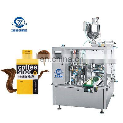 Product ParamentersItem NO.ZC-Y200/250DimensionsL4000mm×W2000mm×H2100mmPacking Speed16-60 Bags/min (depending on products character and filling volume)Packing Bag SizeL: 100-350mmW : 60-200mm/80-250mmWeight1800KGAir Compressed air consemed≤0.6m³ / minAccuracy±1g (≤100g) / ± 1%( >100g) according to materialApplicationSuitable for liquid or semifluid products packing, such as beverages, juice, ketchup, bechamel etc.Working Procedure1.Bag feeding2.Coding3.Opening4.Filling A5.Filling B6.Heat sealing A7.Heat sealing B8.Forming and outputDescription1.According to customer demand for customized, to recommend the appropriate products to customers.2.Storage racks devices which can Satisfy the products short stop ,which can keep the production line work continuously.3.Good service,If you have any questions, you can communicate by telephone video.Recommend ProductsProducts DescriptionCompany ProfileFAQTrade patterns 1. Lead time: 15-20 working days after receive deposit2. MOQ: 1 set.3.30% deposit+ balance payment before delivery by T/T, western union, cash.4. Loading Port: Shantou or Shenzhen Port Export Process 1. We will prepare goods after receive deposit 2. We will send goods to your warehouse or shipping company in China.3. We will give you tracking number or Bill of loading when your goods is on the way 4. Finally your goods will arrive your address or shipping port Frequently Asked Questions Q: First time import, how can I believe that you would send products? A: We are verified company by Alibaba to make transaction success, we support and recommend you to pay money to us by Alibaba Trade Assurance.Q: How about the quality of your product?A: Our products manufactured strictly according to national and international standard-- We have ISO certification-- We take a test on every product before delivery.Q: How to choose the machine type for our bags? A: Pls support us the following information about the bag and the food. 1) Bag pattern (Bag samples or pictures would be appreciated.)2) Bag size 3) The filling weight or volume 4) Material of food: powder/liquid/paste/granular/massiveness Q: What aftersales service or any question about products?A: This machine enjoys 1 year warranty