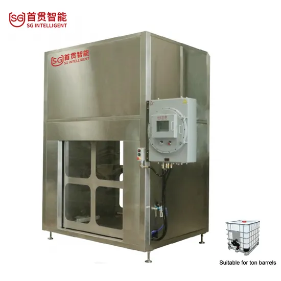 Product DescriptionThis project adopts full-process automated packaging such as visual mouth search, automatic lid opening, automatic diving, automatic fast full-speed filling, automatic leak detection, and automatic capping. It adopts the filling method below the liquid surface, which can be applied to the filling of a variety of liquid materials; during operation, the IBC barrel is automatically transported to the bottom of the spray gun; after the detection barrel is in place, the spray gun enters the barrel mouth, the empty barrel is automatically peeled, and then accurately filled at two speeds; when the filling reaches the set value, the filling is over, the spray gun is automatically lifted to the outside of the barrel, and a cycle is completed.Main features: