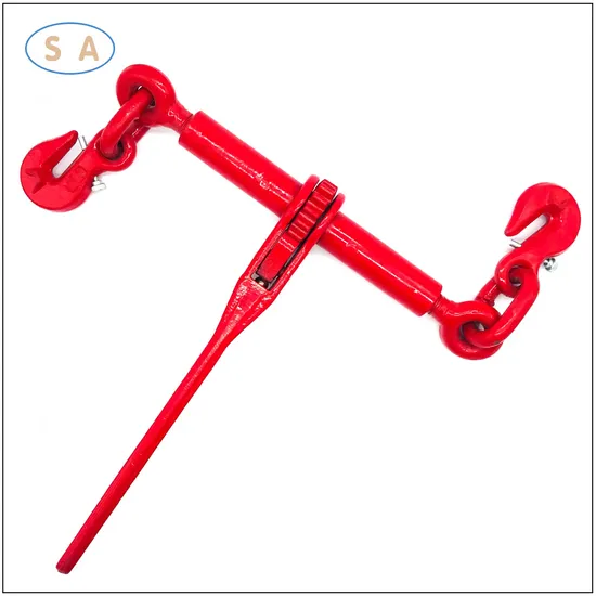 * Type: ratchet type.with hook and pin * Material: Alloy steel / Carbon steel. * Surface finish: Painted. * High quality load binder with drop Forged steel body * Alloy Grab hook is durable for lashing chain. * Hot-Treated ratchet is more robust. Heavy duty steel safety hooks. * Simple to assemble with chains without using any intermediate coupling links * Customized sizes are welcome * Any other types: EN12195-3 Ratchet load binder, lever type load binder, spring load