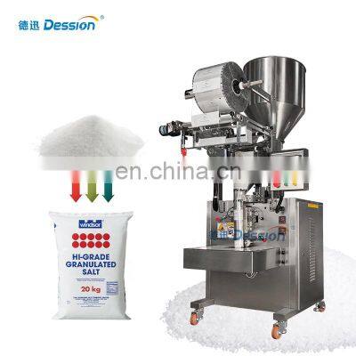 High-accuracy small pepper packing machine by volume salt and pepper packing machine for 200g 300g 400g 500gProduct DescriptionDession granule packing machine is suitable for loose rounded granules in the food, chemical and other industrial. Such as: puffed granules, peanuts, popcorn,melon seeds, rice, pepper, sugar,salt, biscuits etc.According to customer needs,the bag types can be changed:back seal, three sides seal, four side seal.1. The section where the material contact is stainless steel as the body of machine is optional for complete or partial stainless steel and all out equipments have passed the CE Standard.2. Optional English or other languages screen display, easy and simple operation. 3. High-sensitivity photoelectric color tracing and digital input of cutting position get more accuracy.4. Packaging speed and length of bags can be set to some extent without further adjustment and parts changing packaging speed and length of bags can be set to some extent without further adjustment and parts changing. 5. Bag-making, filling, sealing, cutting, counting can be achieved automatically and straightly. 6. Bag-making equipment can be changed according to specific requirement of customers and products.Model NO.DS-320AMeasuringMeasuring cupBag ShapeBack Sealing / 3 Sides Sealing / 4 Sides SealingPacking Speed30-80 bags/minRoll WidthMax.320mmBag Length30~170 mmBag Width30~140 mmMachine SizeL)1450*W)1050*H)1900mmMachine Weight400gPower220V,50/60HZ,1.5KVAEasy Control Touch ScreenLanguage: Standard English and Chinese. Any language can be customized.PLC: Imported PLC microcomputer with interface and frequency control enables bag parameter setting more convenient and easier. Film RollerThe film can be replaced easily on the film roller.Various films adaptable: OPP/CPP,OPP/CE,MST/PE/PET/PE.Measuring cup#304 stainless steel measurement parts will measure the weight of each bag automatically.Bag Former#304 stainless steel bag former is for shaping the film into a bag.Different bag width needs different bag former.Durable Sealing Cutting BladesHigh speed of fine and clean cutting and sealing bags.Positioned stop function avoides sticking blades and wasting materials.According to customer needs,the bag types can be changed:back seal, three sides seal, four side seal.Depending on your needs, you can choose to replace or add the following configuration. For example, 3 sides sealing device, 4 sides sealing device, linking bag device, gas-filled device, easy tearing device and hole device.Related ProductsOur CompanyCertificationsPacking & DeliveryPayment1.T/T and Western Union are accepted2.30% deposit before production and 70% balance before shipment3.All banking charges outside China are on buyersShipping1.Upon receipt of payment , delivery date will be in 15-30 working days,2.By Air, by Sea or by Express (DHL etc)3.Shipment cost will depend on the destination, shipment way and the weight of the goodsFAQQ1:Do you have manual or operation video for us to know more about the machine? Yes, not only manual or operation video, 3D drawing also available to make as per your design,also the video we can make of testing the material from our packaging machine if your packing goods easier for us to find from our local market. Q2:How can I trust you for the first time business ?Please note our above business license and certificate. And if you don't trust us, then we can use Alibaba trade assuranceservice, guarantee your money, and guarantee your machine's on-time delivery and machine quality.Q3:Is engineer available to serve oversea?Yes, but the travel fee is paid by you. So actually to save your cost, we will send you a video of full details machine installation and assist you till the end.Q4:How can we make sure about the machine quality after we put the order?Before delivery, we will send you the pictures and videos for you to check the quality, and also you can arrange for quality checking by yourself or by your contacts in China.Q5:Will you provides the door to door service?Yes. Please offer us your final destination, we will check with our agent to see if it available, and most of the area is ok for us to clearing and sending in your countries.Our Service