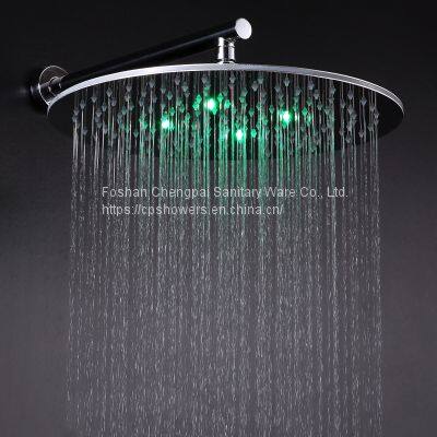 1.This 12-inch round LED lighting rain shower set, ceiling mounted, feature Grade 304 stainless steel construction. Its coordinated pieces including the shower head, valve panel, holder, hand held shower head and shower arm.