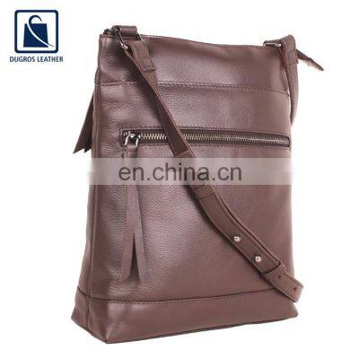 Product Description Chairman Lining Modern Design Zipper Closure Type Genuine Leather Men Sling Bag at Best Price We are engaged in the manufacture, export and supply of a massive assemblage of Sling bag. Sling Bag that are made using supreme quality leather obtained from our vendors. Vastly acknowledged for their lightweight and optimum finishing, these Sling Bags are massively demanded and can be availed at reasonable rates. WE CAN WORK FOR THE PRIVATE LABEL Specification Product NameSling BagMain MaterialGenuine LeatherFittingsSilver Antique StitchingMatchingLining MaterialChairman GenderFemale Product Type Sling BagDimension (HXLXW) in cm29.5x22.5x6.5 Colors AvailableBlack,Brown,Cognac,Green Grey,Customize Etc. Packing & ShippingAbout Us Dugros Leather India Pvt. Ltd., founded in 2006, is an ISO 9001:2015 certified and BSCI –compliant professional OEM/ODM manufacturer. We have been specialized in designing and manufacturing all kinds of genuine leather bags, wallets and accessories for over 15 years. We also have an in-house well equipped LWG certified tannery which processes raw skin to produce finished leather to cater our factories based on the customer’s requirement, thus keeping the quality of leather in control and offering very competitive prices. Other than leather, we also make bags in canvas, jute, nylon and PU. We have been cooperating with clients from Europe, North America, South America and Asia.Our 3 production units all located in Kolkata (India) with two of them in the leather hub of the city (Leather complex, “Bantalla”) along with an in-house tannery, with more than 500 professional and skilful workers, equipped with modern facilities and total production area of 10,000/sq. meters, our monthly capacity reaches 50,000 bags and 1,00,000 wallets.Over the past 15 years, due to the excellent quality, competitive price as well as fast customer service, Dugros has been well known as a reliable and capable supplier to many international group and brands. Our R&D department which is equipped with over 40 professional sample technicians that can create 200pcs new styles every month.Ever since our foundation, we have been focusing on strict quality control over the production to ensure the quality of our every delivery by implementing a ratio of 1QC/20 workers. Our leather/Hardware/Painting edge/Reinforcement/Lining have all passed eco-friendly tests by Intertek and Bureau Veritas.Reasonable prices, the best quality, and reliable service are the soul of Dugros. Trust us, we can work together to create a bright future. Certificates Our Services SAMPLE SERVICES We can replicate any design provided by you and as per your specimen sheet. After making the sample, we do prepare cost sheet and quote our best price based on the quantity. The lead time is 7 to 15 days, depending on the product. Sample prices charged will be refunded after we receive an order according to our MOQ. CUSTOMIZED SERVICES Customized logo can be printed. Sample orders are accepted. Quick response and fast delivery are guaranteed. Customers' designs are welcome. LOGO SERVICES Engraving Laser printing. Silk screen printing: used for simple logos. Colorful foil logos. Rubber sticker printing. UV printing (matte/glossy): used for special material printing. We have all these printing craft and can do as your requirement. AFTER-SALES SERVICES When you place an order with us, during production we will capture clear photos of your products so you can see them step by step. We can book container for you by our forwarder and calculate all kinds of costs during shipping and keep follow up of your goods. If our goods have any kind of problem or quality issue, you can contact us anytime and we will do our best to solve the issue. FAQ 1. Q. Can your factory make any leather goods? A. We have 15 years of expertise in producing leather men’s bag, ladies handbag, backpack, office bag, travel bag, wallets, credit card holders, passport covers, clutches, pouches, slings, key holders, Aprons, gloves, kitchen appliances etc. We also make bags in canvas, fabric, jute, PU. 2. Q. Are those products on your website all genuine leather? A. We primarily deal in genuine leather as we produce the leather ourselves in our in-house tannery. But we do also make goods out of canvas, jute, fabric and PU. 3. Q. What about your products, do they meet the European's environmental standards?A. We abide the EU regulations and meet the standards as we are an SA 8000, LWG Tanners, and ISO 9001:2015 - company. 4. Q. What payment method can you accept?A. PayPal, L/C, D/P, T/T, 30% ADVANCE PAYMENT payments for offline orders. 5. Q. What is your MOQ?A. Bags- 100-200 pcs per style per color. Wallets- 200-300 pcs style per color. Small accessories: 300-500 pcs per style per color. 6. Q. What about the lead time?A. 45-80 days depending on the product and quantity. 7. Q. How can I visit your factory? A. (a) OFFICE ADDRESS- 21E, Gorachand road Kolkata-700014 West Bengal, India. (b) FACTORY ADDRESS- zone no.8/plot 622 Kolkata leather complex Kolkata-743502 WestBengal, India.Get in Touch with Us
