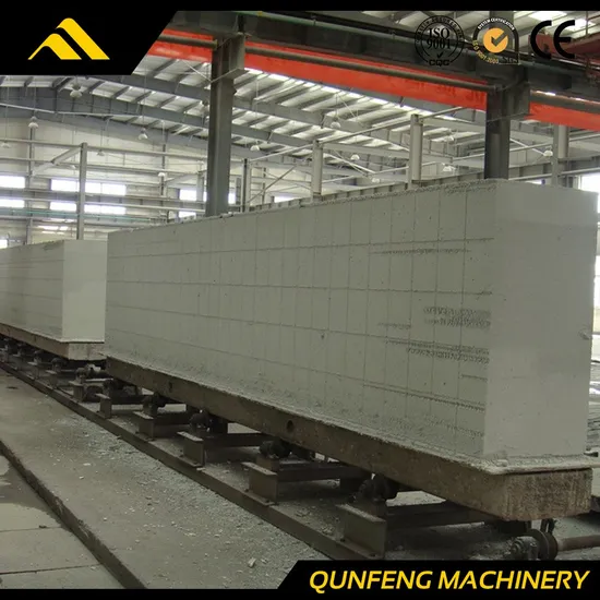 (17)Ferry Cart (18)Turning Crane (19)Vertical Cutting Machine (20)Horizontal Cutting Machine (21)Turning&Grouping Crane (22)Curing Cart (23)Autoclave (24)Finished Product Crane (25)Block Clamping Machine (26)Winch For Side Plate Return Technological process: 1. First, dose and match measured raw materials; 2. After distributing, feed raw material into pouring mixer to make slurry. 3. Through thoroughly mixing, the slurry is poured to mould; , 4. After pre-curing under a certain temperature and time, the block would reach a certain hardness and prepare for cutting; 5. Tilting hoister would turn over 90 degrees of mould; 6. Then open the mould and separate it from block. And take the block with side plate to the cutting cart; 7. Firstly, the cutting machine vertical cuts blocks from both sides. 8. Secondly the horizontal cutting; 9. Finally the vertical cutting; 10. After cutting, the block is hanged to trolley with side plate by semi-finished product hoister; 11. Organizing the cut blocks and put them into autoclaves; 12. Hardening the blocks under certain temperature and pressure; 13. Carry the finished product out of autoclave 14. The finished product hoister take the finished product to stock shield; 15. Packed for loading; 16. The side plate return back through side plate roller; 17. Side plate would be organized with open mould; . 18. Clean the mould and prepare for next pouring; 19. Steel bars processing line for slab production.