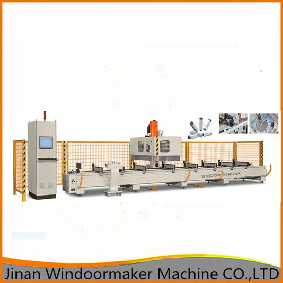 Specification : Using advanced industrial CNC systems, friendly human-machine interface, simple operation and trustable function Suitable for aluminum alloy, aluminum and wood composite profile, and other light alloys of copper, as well as the UPVC profile processing In the range of 90°~0°~-90° four axis unite machining One time clamping can complete milling, drilling, chamfering, grooving and other multi-functional precision machining Made of high strength welding structure, after thermal aging annealing processing guarantee high rigidity and high stability Adopts imported high precision linear guide rail, ball screws, gear racks and servo motor, ensuring smooth motion, positioning and processing of high precision High-quality imported automatic tool change for high speed motorized spindle ensure stability, stability of rotation noise, cutting ability. Equipped with 8 tools store, adjustable pneumatic clamping ensure efficient processing. Double table for two parts, or two kinds of profile machining, interactive feeding, non interference. Technical Parameters: