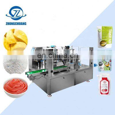Product ParamentersItem NO.ZC-R200/250DimensionsL2460mm×W1830mm×H1460mmPacking Speed16-60 Bags/min (depending on products character and filling volume)Packing Bag SizeL: 100-350mmW : 60-200mm/80-250mmWeight1800KGAir Compressed air consemed≤0.6m³ / minAccuracy±1g (≤100g) / ± 1%( >100g) according to materialApplicationSuitable for liquid or semifluid products packing, such as beverages, juice, ketchup, bechamel etc.Working Procedure1.Bag feeding2.Coding3.Opening4.Filling A5.Filling B6.Heat sealing A7.Heat sealing B8.Forming and outputDescription1.According to customer demand for customized, to recommend the appropriate products to customers.2.Storage racks devices which can Satisfy the products short stop ,which can keep the production line work continuously.3.Good service,If you have any questions, you can communicate by telephone video.Recommend ProductsProducts DescriptionCompany ProfileFAQTrade patterns 1. Lead time: 15-20 working days after receive deposit2. MOQ: 1 set.3.30% deposit+ balance payment before delivery by T/T, western union, cash.4. Loading Port: Shantou or Shenzhen Port Export Process 1. We will prepare goods after receive deposit 2. We will send goods to your warehouse or shipping company in China.3. We will give you tracking number or Bill of loading when your goods is on the way 4. Finally your goods will arrive your address or shipping port Frequently Asked Questions Q: First time import, how can I believe that you would send products? A: We are verified company by Alibaba to make transaction success, we support and recommend you to pay money to us by Alibaba Trade Assurance.Q: How about the quality of your product?A: Our products manufactured strictly according to national and international standard-- We have ISO certification-- We take a test on every product before delivery.Q: How to choose the machine type for our bags? A: Pls support us the following information about the bag and the food. 1) Bag pattern (Bag samples or pictures would be appreciated.)2) Bag size 3) The filling weight or volume 4) Material of food: powder/liquid/paste/granular/massiveness Q: What aftersales service or any question about products?A: This machine enjoys 1 year warranty