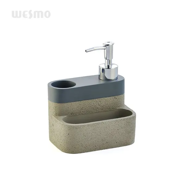Manufacturer custom polyresin detergent dispenser with sponge holder (WBP1708A) A smart design with multi functions, this soap dispenser is designed for containing sanitizer, brush and sponge, it will be a great choice to neaten your kitchen. [One-piece]