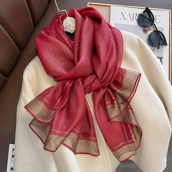 - It is lightweight, creates effortless beautiful drapes and flows. - Glimmering flowy long scarf - Gold lined trim - Bold tone - Semi-sheer