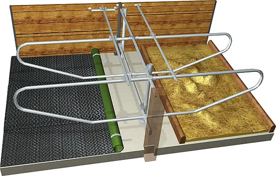 Clear bar spacing: 6 cm • Side filling • Integrated roof edge protection, no injury risk • Also suitable for deer • Feeding height: 79 cm • Incl. bolts for ground anchoring • Detachable feet