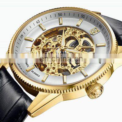 Title High quality Relojes Hombre Custom Black Leather Gold Wrist Watches Skeleton Mechanical Watches Men Luxury Brand Automaticc [ OEM & ODM ]Product DescriptionCase materialStainless steelCase ColourSilver or Rose gold or Gold or BlackDiameter Size 45MMStrap MaterialGenuine Leather Strap Width 24MM-22MMClaspSteel buckleCase backStainless steel backMovementMechanical Automatic movementWater Resistant10ATMDialCustomizedBrandCustomized Your LogoSample leadtime3-5 days for stock modelsMass production time30-45 working daysRelated ProductsFor further information about above models, pls contact us!Company InformationHK Dualtime watch industry Co., Ltd is a watch manufacturer build up in 2009 and passes through the certification of ISO9001. The factory area is 1400 square meters, and the annual yield is 500000pcs watches. The company owns a professional research & development team. We can do 300 meter waterproof with good quality. There are more than 2000 watch styles and more than 500 watch samples available, which include lovers series, lady series, sports series, military watch series, gentleman series, electronic series and gemstone series. Most watches are exported to Europe, America, and Southeast Asia. Package & ShippingStandard Package (Free of charge)10 pcs watches inside one foam tray, then 10 trays inside one outer carton. Custom-made Package (with charge)If you have Custom-made package, we can source for you. ShippingMany friends concern about the shipping cost, normally the goods will send out through DHL, UPS, TNT, EMS, FedEx(door to door) if you do not have a domestic forwarder in China. The cost mostly depends on the final choice for the watch models, packing and shipping method, for sure we will recommending the most economic one for you.Certifications Our ServicesQuality checking standard:1. All incoming parts and assembled watched will be checked carefully during the whole process.2. All watches will be passed through the waterproof testing.3. All watches can be complied with CE/RoHS, nickel free, etc. 100% safety strap, comfortable, eco-friendly and non toxic to body.Gurantee period:Our gurantee period is one year since the delivery time of mass shipment. During this period, we will take full responsiblilty for all deffective caused by normal using. Either you can send back for repairs, or we send out new parts for your replacement. FAQQ: What is your MOQ? Can i mix colors & styles?A: No MOQ limited for stock watches. Q: Can we have our logo on the watches?A: Yes, you can. Q: Will you provide samples and how much is it?A: sample cost for stock model will be US$50/PC. If need customized logo sample, it will cost US$100/PC. Q: How long is the delivery time of samples and mass order?A: 3-5 days for stock samples without logo, 30-45 working days for mass order if we have enough stock parts. Q: About paymentA: by T.T. If sample order, full payment before shipment. If mass order, 30% deposit after order confirmation, 70% balance beofre mass shipment. For more discounted products, pls contact us as below. Thanks!