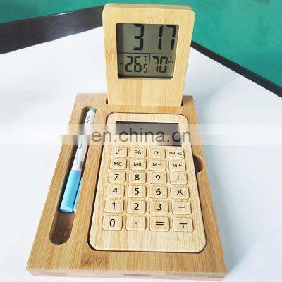 Bamboo wooden logo scientific calculator pen tray weather electronic alarm clock with temperature and humidity three-piece set