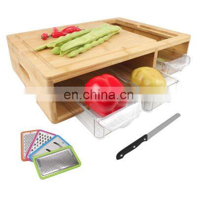 Organic Bamboo Kitchen Cutting Board Juice Grooves With 3 Containers Trays And Lids