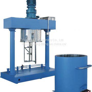 When the planet frame rotates, while driving three axes of mixing and dispersing , when they are rotating they are also revolution at the same time. So that the material can be strongly cutting off, impact, so that can be totally mixing and dispersing. There is one scrapper at the planet frame, which will rotating when start, can take the material at the kettle wall let no material stay on the kettle wall, so that the mixing will be more effect. Mixing time can be controlled by the operator for different type of material on the control panel. The mixing kettle can be lift by two hydraulic oil cylinder easy to operate.