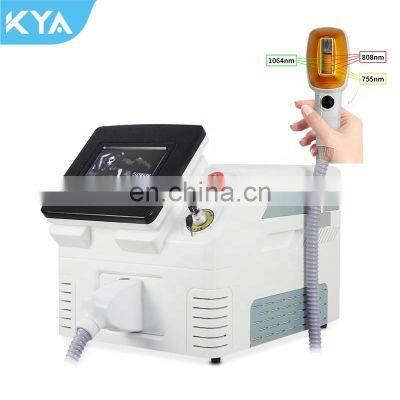 Factory price Real 755 808 1064 A-lma So-prano Ice platinum Portable Diode Laser Hair Removal DeviceProduct DescriptionPrinciple :755 808 1064nm wavelength laser can penetrate skin epidermis to reach the deep hair follicle tissue, through specially set pulse duration to protect target tissue to produce enough heat damage, the surrounding tissue almost unaffected.Adequate energy density guarantees sufficient energy output to damage the target tissue within the appropriate time, and the normal tissue is also almost unaffected; the appropriate skin protection measures protect the target tissue enough damage, and the epidermis is almost unaffected, thus ensuring the safety of treatment. Hair follicle tissue and after absorbing the energy and heat of the laser is heated to about 50 degrees, hair follicle and growth stem cells that lose their growth activity, so as to achieve the purpose of permanent hair removal.Five advantages:1. Triple Wavelength: 1064nm +Diode 808nm + 755nm, 3 in 1 all skin type can be used2. High power: NEW 1000W handle3. Big spot size 13*20mm, 13*30mm for face & body hair removal solution!4. Cooling system: Unique Dual- TEC cooling system, most effective to ensure machine work all day, 24hr no down time.5. Long life: 20 million times effective service life.Waves laser combines 755nm 808nm 1064nm, suits for all skin and hair types treatment.755nm for white skin (fine/ golden hair) hair removal.808nm for yellow (natural) skin hair removal.1064nm for black skin (black hair) hair removal.SpecificationitemvaluePlace of OriginChinaProvinceGuangdongBrand NamekyaModel NumberKYA-E808TWavelength755nm 808nm 1064nmLaser TypeDiode LaserStylePORTABLETypeLaserFeatureHair Removal, Skin RejuvenationApplicationFor CommercialAfter-sales Service ProvidedOnline support, Video technical supportWarranty1 YearName755 808 1064 Diode laser hair removal deviceProduct efficacyPainless hair removal+Skin rejuvenationLaser typeSemiconductor laserLaser Bars10 barsWavelength808nmSpot size13*30mmHandle power1000WMachine power1200WCooling methodAir cooling+Water coolingVoltage110V/220V 50/60HZPacking & DeliveryAir BoxCompany ProfileGuangzhou KYA Electronics Co., Ltd. was established in 2017. It has more than 1,200 square meters of production workshops and advanced production equipment. It is a company specializing in R & D, production, sales and service of high-end beauty equipment. The company focuses on the production of beauty equipment such as intelligent skin management and body management. The main products include: facial anti-aging, product introduction, skin rejuvenation, wrinkle removal series, intelligent skin tester, health care series, beauty equipment supplies and other beauty professional line instruments. Masks, goggle, Protective clothing and other daily textile products. The product has obtained CE certification from the European Union. It is produced in accordance with ISO standardized operations. It has a strong R & D team and an experienced management team. Welcome domestic and foreign OEM / ODM customization, the company insists on creating brand with quality, integrity and high quality service.FAQ1. who are we?We are based in Guangdong, China, start from 2017,sell to Domestic Market(20.00%),Southeast Asia(7.00%),Central America(6.00%),North America(6.00%),South America(5.00%),Southern Europe(5.00%),Eastern Europe(5.00%),Northern Europe(5.00%),Eastern Asia(4.00%),Western Europe(4.00%),Mid East(3.00%),South Asia(3.00%),Africa(2.00%),Oceania(1.00%). There are total about 11-50 people in our office.2. how can we guarantee quality?Always a pre-production sample before mass production;Always final Inspection before shipment;3.what can you buy from us?Face beauty machine,Body beauty macine,Protective mask4. why should you buy from us not from other suppliers?1. Direct Manufacturer2. Quality guarantee3. Have a professional after-sales technician5. what services can we provide?Accepted Delivery Terms: null;Accepted Payment Currency:USD;Accepted Payment Type: Western Union;Language Spoken:English,Chinese