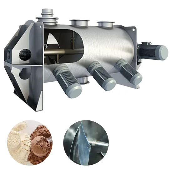 The Horizontal Ploughshare Mixer is a single-shaft forced mixing device equipped with multiple sets of ploughshare agitators. These agitators are staggered and continuously installed to avoid mixing dead spots. During operation, the staggered ploughs create continuous vortex centrifugal forces, leading to overlapping and scattering of the material flows, resulting in a boiling and convective circulation that rapidly mixes the materials.
