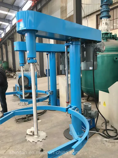 it can make the material quickly dispersed and dissolved, the particles become fine, with advantages such as evenly stirring no dead angle, easy cleaning; frequency conversion, digital speed display; working continuously for a long time, stable operation, small noise, hydraulic lifting stability.