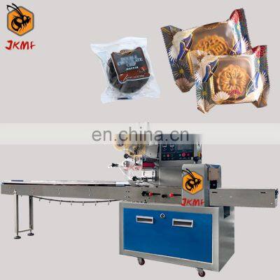 High Speed Automatic Cake Tray Pillow Packing Machine Moon Cake Flow Packing Machine Small Cup Cake Wrapping MachineProducts DescriptionThe JKMF flow packing machine features quick, easy changeover and adjustment that minimizes product and film waste and reduces maintenance costs.The machine working starts with a cylindrical roll of film. The flow wrapping machine will transfer the film from the roll and through to the forming collar (sometimes referred to as tube or plow). At the same time, a conveyor has lined up individual products for wrapping. The film is fed through the collar and the product is surrounded with film, sealed and the film is then cut. The finished individual product is then gathered downstream to be bagged or cartoned prior to boxing and palletizing.Automatic flow packing machine is a widely used packing machine. Suitable for all kinds of product packaging. Including medical supplies, vegetables and meat, baked bread, snacks and candy, daily necessities, hardware accessories, etc.Machine ParamentersJKMF flow packing machine, packaging speed is fast, the efficiency is high, the packaging process is clean and hygienic, and the operation is simple. Choose the right packaging equipment for your operation and get the highest levels of safety, shelf life, flavor retention, and appearance at every stage of production.The process of automatic bag making, date coding, labeling, weighing, and packaging is completed at one time.ModelJK-250BJK-350BJK-450BJK-600BFilm WidthMax.250 mmMax.350 mmMax.450 mmMax.600 mmBag Length65~330 mm65~330 mm120~450 mm130~600 mmBag Width30~110 mm50~160 mm60~210 mm60~280 mmProduct HeightMax. 40/55 mmMax. 45/80 mmMax. 110 mmMax. 110 mmPacking Speed40~230 bags/min40~230 bags/min30~180 bags/min20~150 bags/minMachine Size(mm)3700*670*14503770*720*14503990*900*14683990*1000*1468Machine Weight450KG500KG550KG800KGMachine Voltage220V, 50/60 HzMachine Power2.4KW2.8KW3.2KW4KWMain Features1.Dual frequency conversion control, Bag length can be set and cut in one step, saving time and film.2.Interface features easy and quick setting and operation.3.Self failure diagnosis, clear failure display.4.High sensitivity photoelectric eye color tracing, numerical input of cutting sealing position for extra accuracy.5.Temperature independent PID control, more suitable for packaging different materials.6.Positioned stop function, without sticking knife or wasting film.7.Simple driving system, reliable working, convenient maintenance.8.All control is realized through software, easy for function adjusting and technical upgrade.Machine DetailsMachine Control CenterThe packaging parameters setting is set on the HMI screen (human machine interface). A pulse is generated for machine movement, and this is transferred to the PLC (programmable logic controller).Including packaging size, packaging speed, etc. Film Holder With Date PrinterWhen the HFFS packaging machine is operating, the film is usually pulled off the roll by film transport belts, which are positioned to the side of the forming tube which is located at the front of the machine. A date printer can be installed on the film holder, so that the production date and other information can be printed on the colleague of the packaging.Replaceable Bag FormerThe film enters a forming tube assembly. As it crests the shoulder (collar) on the forming tube, it is folded around the tube so that the end result is a length of film with the two outer edges of the film overlapping each other. Middle Bag Heat Sealing DeviceThe horizontal seal bar, which is hot, moves forward and makes contact with the horizontal overlap on the film, bonding the layers of film together.Bag Heat Sealing Cutting DeviceA set of heated horizontal sealing jaws come together to make the top seal of one bag and the bottom seal of the next bag. While the sealing jaws are closed, the product that is being packaged is dropped down the middle of the hollow forming tube and filled into the bag.This is a complete packaging process, you will get the perfect packaging finished product.If your product needs to be filled with nitrogen to ensure the freshness of the product, then you need to purchase a set of nitrogen production equipment. In addition, our machines can also be equipped with labeling machines, date coding machines, etc. to meet your production needs.Why Choose UsJIKE BEE MACHINERY has a professional team to provide customers with various packaging solutions. Fully understanding the needs of customers,engineers design the most suitable solution. We have our own processing and assembly workshop and quality inspection and debugging process to ensure the quality of the machine. After acceptance by the customer, they are packed in international standard wooden cases and shipped.The machine has more than 10 advanced patented technologies, CE certificate, ISO9001 certification, etc.We will package the machine's instruction manual and a USB flash drive with machine operation videos together with the machine.Ensure that you can use the machine as soon as you receive it. If you have something you don't understand, our after-sales team will also help you answer in time.Our customers have covered more than 80 countries around the world.And give us unanimous praise.Company ProfileFoshan Jike Bee Automation Equipment Co., Ltd. is a manufacturer of automatic packaging equipment.We are a production-oriented enterprises focused on product innovation, factory direct sales and perfect after-sales service in one. Mainly applicable to: food, hardware, drugs, daily chemicals, pesticides, fruits and vegetables, cosmetics, other industries.The company has its own patent and product technical certification, which can bring customers high quality equipment and worthy of customer trust.FAQQ1:Do you have manual or operation video for us to know more about the machine?Yes, not only manual or operation video, 3D drawing also available to make as per your design,also the video we can make