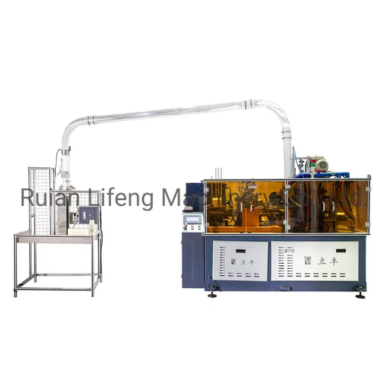 LF-90 MID-speed paper cup forming machine is a multi station high-speed automatic machine producing both single and double PE coated drink cups, ice cream cups through continuous process of automatic paper feeding, sealing, oil injection, bottom cutting, heating, knurling, curling and stacking. The machine adopting hot air system, PLC control, servo motor driving, full-automatic failure warning, counting, detection, stopping, etc.