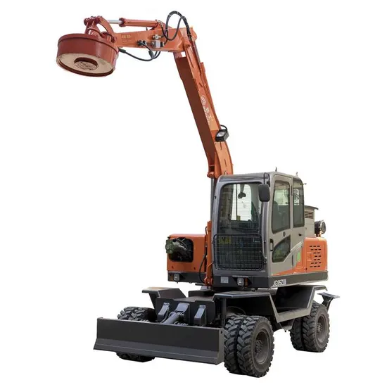 Wheel excavator with electro and magnetic sucker magnet chuck for lifting steel scraps