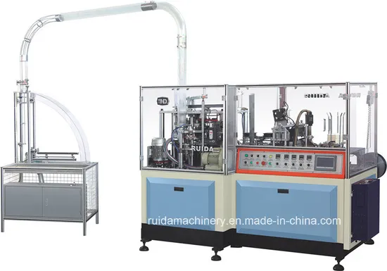 RD-12/22-100A high speed paper cup machine comes with two turnplate, open intermittent indexing cam mechanism and gear transmission, longitudinal axis structures.