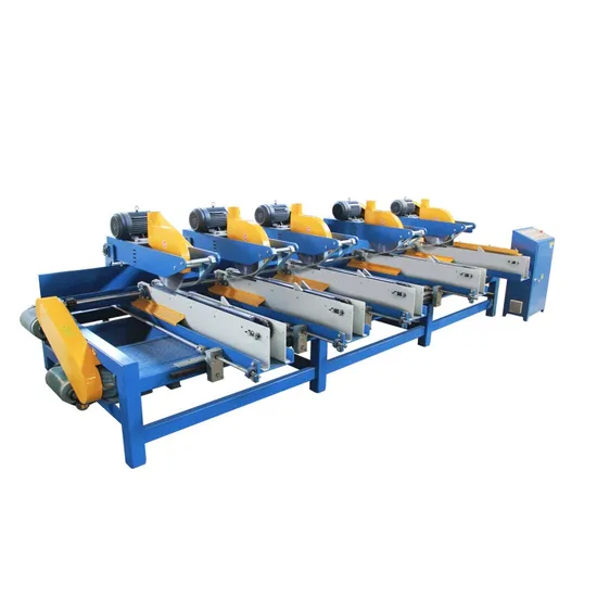 Working video link: https://youtu.be/KFh5aes4Cjw Features 5 circular saws, set at either equal or various distances from each other, depending on the application at hand. Each saw head can easily be positioned independently using a lockable saw head positioner. As boards are fed in laterally, these saws cut them individually into shorter pieces all at once.
