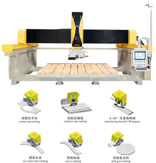 This stone cutting machine is a mono-bloc 5-axis CNC machine. Besides straight cutting, this stone machine is also able to make polygon cutting, straight/arc stone line cutting, curve cutting, vanity top cutting, internal/external round shape cutting and chamfering.