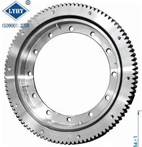 All LYHY slewing ring bearings are forged rings with material steel 50Mn or 42CrMo, slewing rings are machined by CNC lathe, slew bearings raceway are quenched via medium-frequency hardening with hardness 55-60HRC, turntable bearings are drilled holes by CNC drilling machine, slew gears are machined by hobbing machine with gear quenched if required, swing bearings then are grinded by grinding machine with higher precision.
