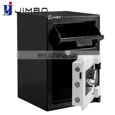 Products DescriptionFireproof safe*Product NameJimbo metal cash drop depository safe box with inner locking compartment drawer*Brand NameJimbo*Product ModelDH Series*MateritalHigh quality cold rolled steel sheet Q235*Door Thickness10 mm*Body Thickness3 mm *LockElectronic Digital Lock*HandleBrushed solid steel handle*CertificateCE/ISO 1182/ROHS/FCC*Available colorWhite , Black , body and door can be in different colors*Packing5 layer standard export carton with thickened foam*SurfaceDurable electrostatic powder coating*Main productsFireproof safe, Bulglarproof safe, Home safe ,Vault door, Watch winder safe, Hotel safe box, Steel Lockers, Filing CabinetsRecommend ProductsCompany ProfileFoshan jimbosafe Co.,Ltd established in 2012, exporting our safe box to more than 118 Countries with over 10 years history . Located in Foshan,Guangdong, Jimbo owns 5,000m2 Modern Workshop, 50 Skilled workers,3 Reliable QC and 10 production machines and passed 4 certification (CE, ROHS, SGS, ISO). Through our experienced sales team, we finish 50,000,000.00+RMB turnover per year and keep growing.As Assessed Supplier by Alibaba, we hope can cooperate with you!Our TeamProduct packagingFAQProduction relatedIf you have any other questions, we would be more than happy to answer them for you. Please contact us below:Mrs. AnnEmail: annie@jimbosafe.com / Jessica@jimbosafe.com / sales01@jimbosafe.comMob & Wechat & WhatsAPP ::+861666567569Q: Do you provide samples?A: We can provide a sample with freight and handling charges at your expense.Q: How do you send your samples?A: We usually send via international couriers such as DHL, FedEx or UPS. We can also work with you if you have other alternative arrangements.Q: What is your lead time? A: Our production lead time is typically between 25 to 45 days from receiving payment, depending on chosen items, quantities and specific requirements. We can have off the shelf goods ready to be shipped in 5 to 10 days if there are available stock and no change request.Q: Is there any warranty offered for the product?A: A two-year Limited free-warranty is offered.Q: What are your payment terms?A: We can work with L/C or 30% deposit upon ordering and remaining balance prior to shipping of products. We can provide photos of finished goods and also accept on site final inspection.