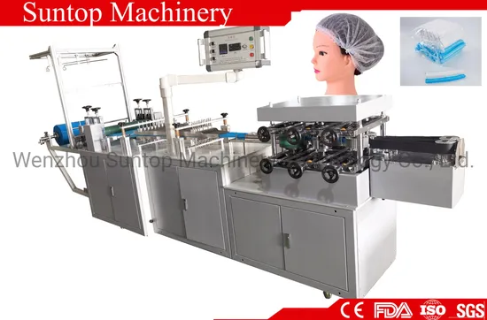 Bouffant Cap Machine Medical Nursing Cap PE Head Cover Non-Woven PP Mop Cap Strip Shower Cap Disposable Cap Making Machine. It adopts ultrasonic heat sealing method, frequency conversion speed regulation, and produces non-woven materials and plastic film materials. The disposable dust-proof non-woven strip caps are integrated into the finished product from feeding to finished products. You just feeding the material (Non-woven or PE Plastic film and rubber band ),then you will get final product.