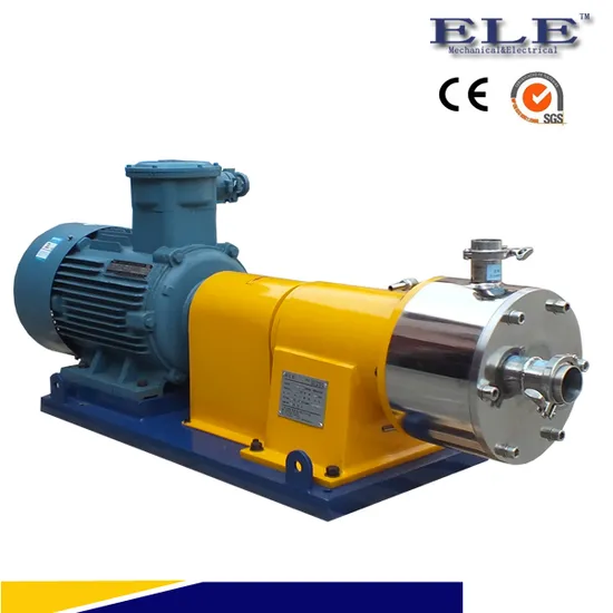 This type of emulsifying pump consists of a couple or several couples of rotor and stator, the high speed rotating rotor forces the material be sucked into the rotor and stator area, forming strong mixing shear action, after being forced to pass the space between the precisely coupled rotor and stator, materials are thrown out from the stator, during the process, the sharp mechanical and liquid shear action tearing and crushing the granules, meanwhile followed materials be sucked into the center of rotor and stator, foregoing materials be pushed out from the outlet, thus achieving the effect of refining, homogenizing, grinding and emulsification.