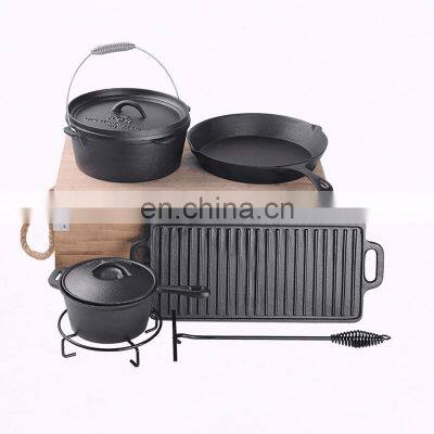 Product DescriptionCamping Outdoor Cast Iron Pot Set CookwareSpecificationitemvaluePans TypeFrying Pans & SkilletsMaterialMetalMetal TypeCast IronApplicable StoveGeneral Use for Gas and Induction CookerPot Cover Typepan lidPot CoverWith Pot CoverCapacity1-2LCommercial BuyerCaterers & Canteens, Restaurants, Fast Food and Takeaway Food Services, Food & Beverage Stores, Specialty Stores, Food & Beverage Manufacture, TV Shopping, Department Stores, Super Markets, Convenience Stores, Cafes and Coffee Shops, Discount Stores, E-commerce Stores, Gifts Stores, Souvenir StoresSeasonEverydayRoom Space SelectionSupportDesktop, Kitchen, Indoor and Outdoor, OutdoorOccasion SelectionSupportGiveaways, Business Gifts, Camping, Travel, Retirement, Party, Graduation, Presents, WeddingHoliday SelectionSupportValentine's Day, Mother's Day, New Baby, Father's Day, Eid holidays, Chinese New Year, Oktoberfest, Christmas, New Year's, Easter Day, Thanksgiving, HalloweenProduct nameCamping Cookware SetUsageOutdoor CookingTypeOutdoor BarbequeStyleOutdoor CookingApplicationOutdoor Equipment Hiking CampingColorBlackFunctionCamping Cooking Outdoor IndoorLogoCustomized LogoHandleOne HandlePackageCartonCompany ProfileDalian Ruici Industry Co., Ltd. is a leading manufacturer and exporter of high profile casting, machining, molds and assembly products, etc. Featuring optimum combination of price and performance, our products are widely used on valves, water pumps, speed reducers, ejectors and automobiles, etc. With over two decades of perseverance and dedication in production and total quality management, we have established a long-term loyal customer base in North America, Europe, East Asia, and Mid East.Our core competitiveness edge lies in total customer solutions. By integrating manufacturing with foreign trade sectors, we can provide total customer solutions by guaranteeing the delivery of right products to the right place at the right time, which is supported by our abundant experiences, powerful production capability, consistent quality, diversified product portfolios and the control of the industry trend as well as our mature before and after sales services. We'd like to share our ideas with you and welcome your comments and questions.FAQ1. who are we?We are based in Liaoning, China, start from 2005,sell to Western Europe(60.00%),North America(20.00%),Southeast Asia(10.00%),Oceania(10.00%). There are total about 51-100 people in our office.2. how can we guarantee quality?Always a pre-production sample before mass production;Always final Inspection before shipment;3.what can you buy from us?Castings,Forgings,Stampings,Valve Parts,CNC Machining4. why should you buy from us not from other suppliers?Over 20 years export experience on casting and machining business, advanced production(CNC and machining center) and inspection equipments (CMM), fully quality control system(ISO 9001:2008), perfect after-sales service. Main market Germany, Japan, USA.....5. what services can we provide?Accepted Delivery Terms: FOB,CFR,CIF,DDP,DDUï¼›Accepted Payment Currency:USD,EUR,JPY,CNY;Accepted Payment Type: T/T,L/C,Western Union;Language Spoken:English,Chinese,Japanese