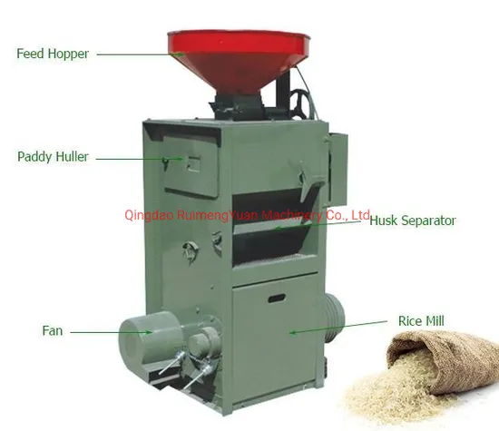 2) Rice goes into machine through vibrating screen and magnet unit.and then forward under rubber-roller for hulling, winnowing and air-blowing to husk.
