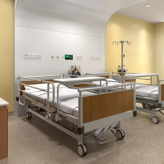 * Clear acrylic bedside card for patient name display, Four infusion holes, two drainage hooks around the bed